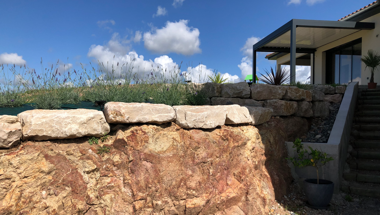 Sur la terrasse, le travertin en opus romain s’invite comme matériau noble. Cette pierre naturelle apporte une touche d’authenticité et de caractère, créant un espace accueillant et intemporel. Enfin, des pierres d’enrochement claires viennent unifier l’ensemble, tissant un lien subtil entre les différents matériaux pour une composition à la fois chaleureuse et authentique.