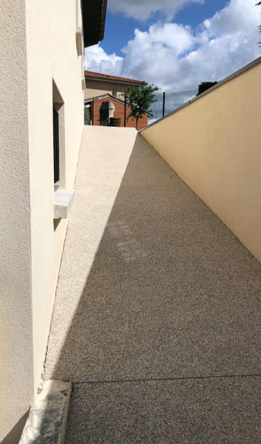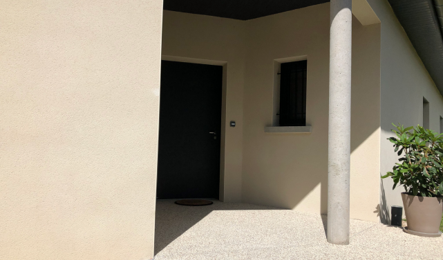 Pour ce projet, nous avons imaginé un aménagement paysager qui met en valeur l’architecture de la maison en jouant sur l’équilibre des matières et des teintes… L’accès et l’entrée se parent de béton désactivé, choisi dans des tons assortis à la façade. Son aspect chaleureux et sa texture antidérapante en font un revêtement aussi esthétique que fonctionnel pour cette exposition nord-est.