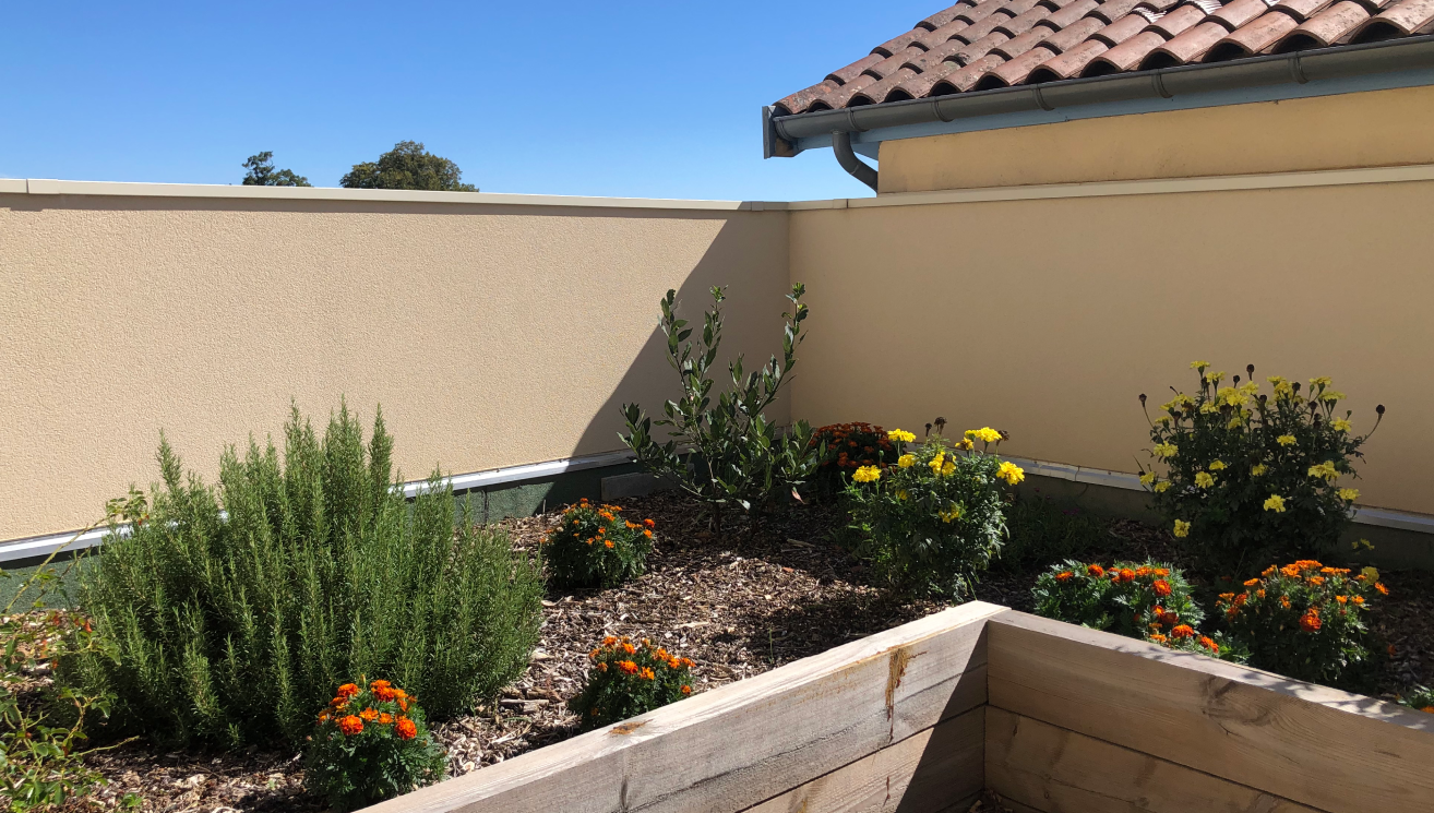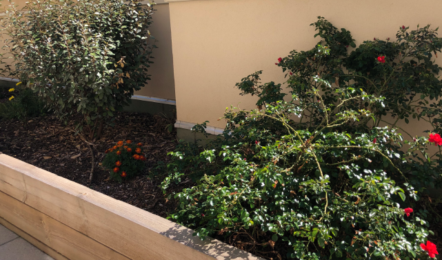 Une longue jardinière en bois structure l’espace, apportant une touche chaleureuse tout en offrant un écrin robuste aux végétaux. Géraniums, Cyprès de Provence, pommiers, lauriers et lavandes composent ce jardin de senteur, où chaque plante a été choisie pour sa capacité à s’épanouir sous le soleil et avec peu de terre.