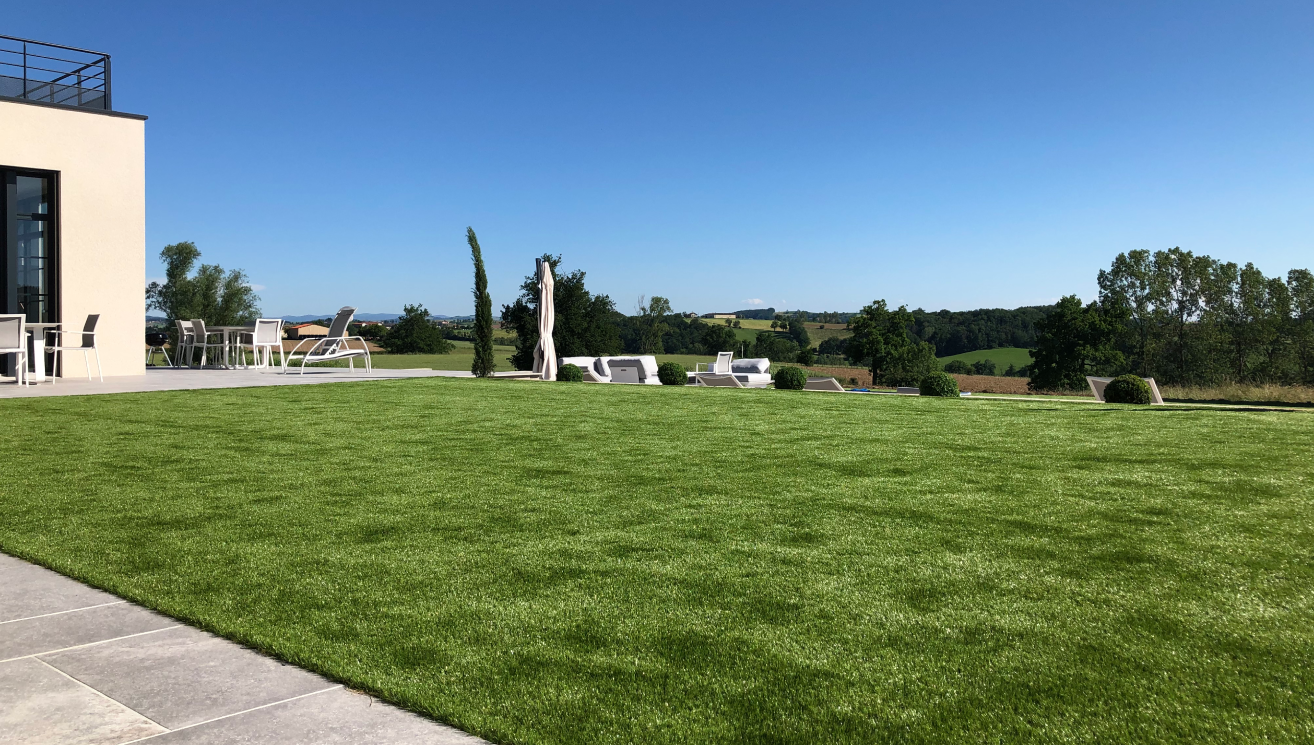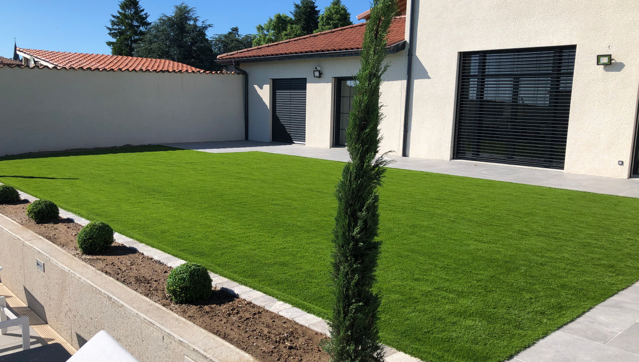 Dans cette cour fermée, où l’ombre des murs rendait difficile l’entretien d’un gazon naturel, nous avons opté pour un revêtement en gazon synthétique. Son aspect verdoyant et soigné apporte une touche de fraîcheur sans les contraintes d’entretien.