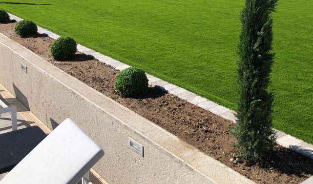 Pour structurer l’espace et adoucir les lignes minérales du solarium, nous avons installé, en bordure de mur, des buis boules et des cyprès de Provence. Leur feuillage persistant crée une présence végétale élégante et naturelle, offrant un écrin de verdure autour de la piscine.